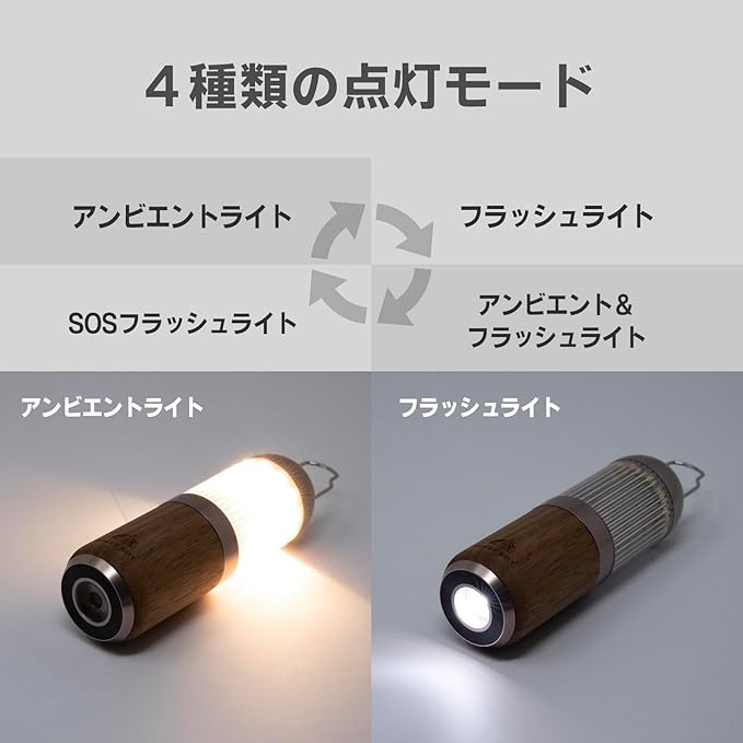 【多彩な点灯モード】 4つの点灯モードがあり、アンビエントライト、フラッシュライト、アンビエント&フラッシュ、SOSフラッシュライトんのモード切替が可能です。 ご利用状況に応じて、様々なシーンや緊急時に適切な照明を提供します。