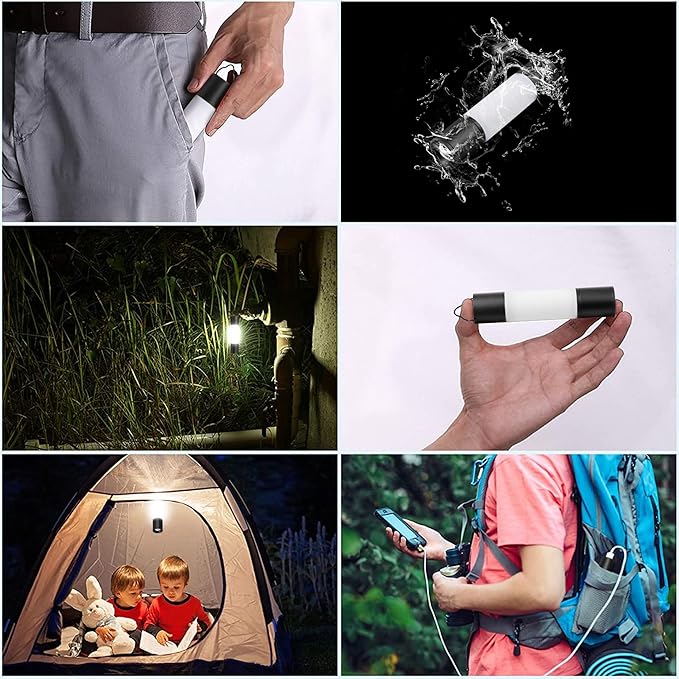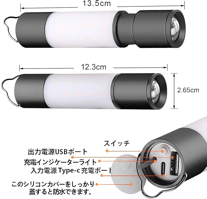 【USB Type-C充電式双方向& アウトドア用ライト】2600mAh充電式のリチウムバッテリーが内臓、付属のUSB Type-C ケーブルで直接に充電することができます。ユニークな充電デザイン、USBポートを水埃から守ります。緊急の場合モバイル電源としても使用できます、 は携帯電話や他の電子機器の充電ができます。