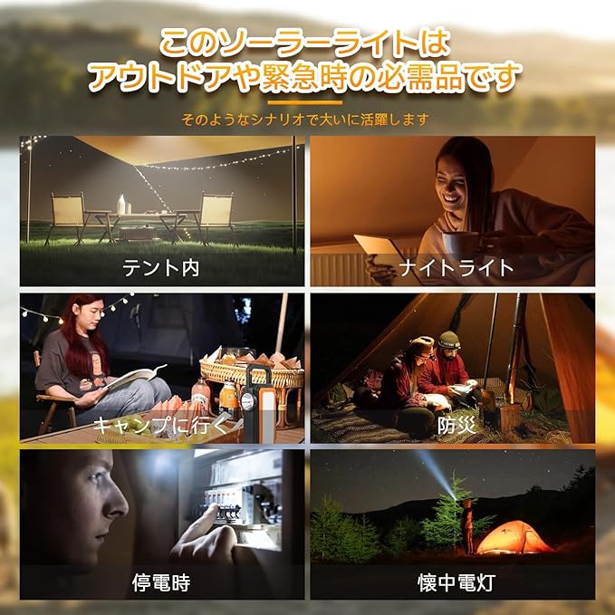 さまざまなシーンで使用可能:キャンプ用テント内の照明としてだけでなく、自宅でのナイトライトとしても活用でき、就寝前の読書やリラックスタイムにも最適です。その用途は非常に幅広く、キャンプや日常生活だけでなく、バーベキュー、室内用ランタン、夜間のトイレ、停電時など、突然の電力不足でも安心です。さらに、防災用品としても利用でき、災害時に救助信号を発信するのにも役立ちます。