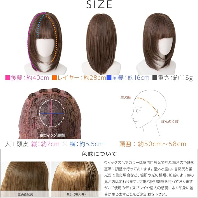 髪の長さ:後髪:約40cm 前髪:約16cm サイド:約28cm 重量:約116g