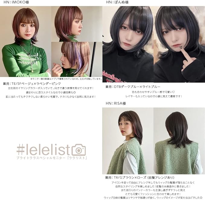 商品説明:鎖骨辺りまでの使いやすい長さで、顔回りにたっぷりレイヤーカットを施したスタイルです。後れ毛も作りやすく、顔回りをスッキリ小顔に見せてくれます。前髪は根元がベタっとしないようにふかし加工でふわっと立ち上がり、少し長めの作りなのでお好みでカットしていただけます。まだまだ人気が熱いインナーカラータイプを5色ご用意し、一味違うお洒落感を出したい方におすすめです。インナーカラーは主張しすぎないので、派手髪は気になるけど勇気が無いな〜という方にも挑戦しやすいデザインになっています。Brightleleならではの左右のカラーが違うアシメインナーカラーにも注目。ベーシックカラーを入れた全9色