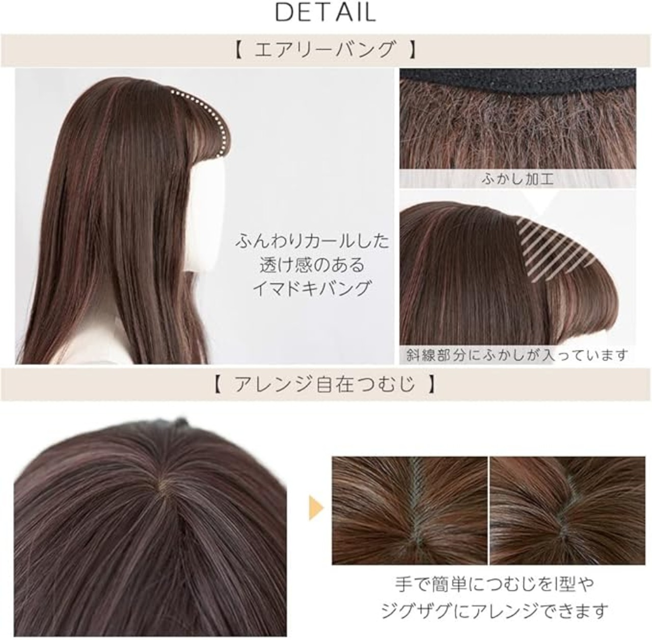 仕様:人工頭皮あり:アレンジ自在つむじ 前髪分け目自由 金属不使用 シャンプー可能 ドライヤー、コテ、アイロン等で好みの髪型に整えることができます。「耐熱温度最大180度」