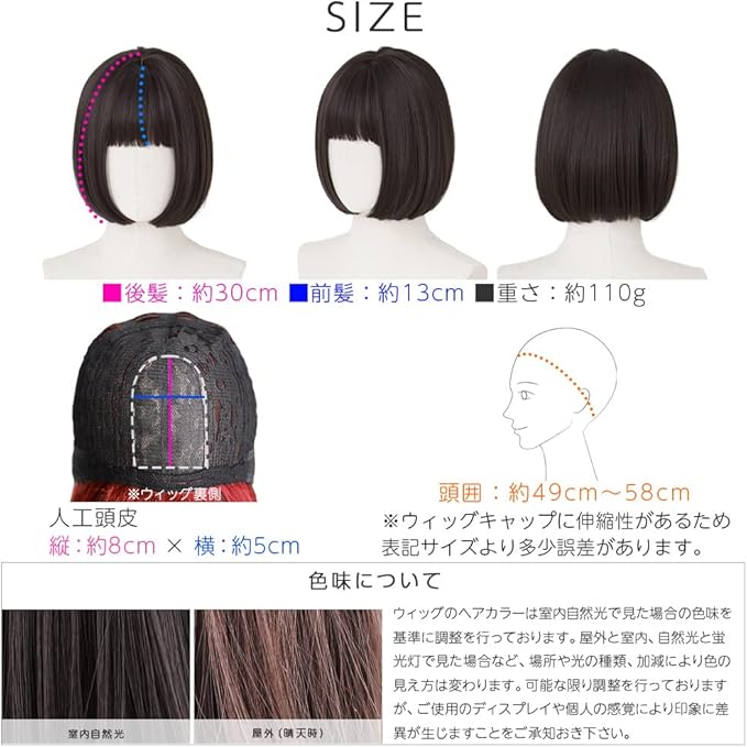 サイズ:フリーサイズ(頭のサイズ約49cmから58cm)アジャスターでサイズ調整可能。※ウィッグに伸縮性がある為、表記サイズより多少誤差があります。