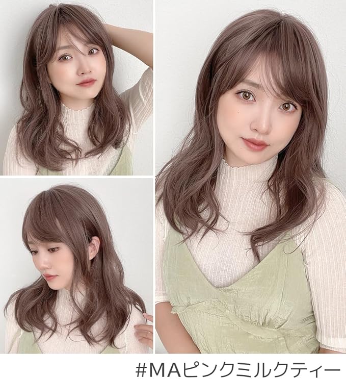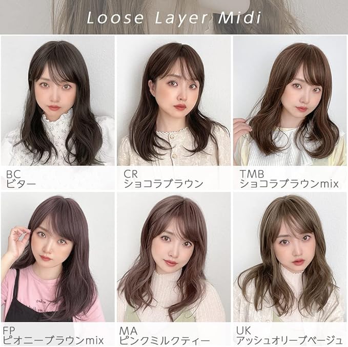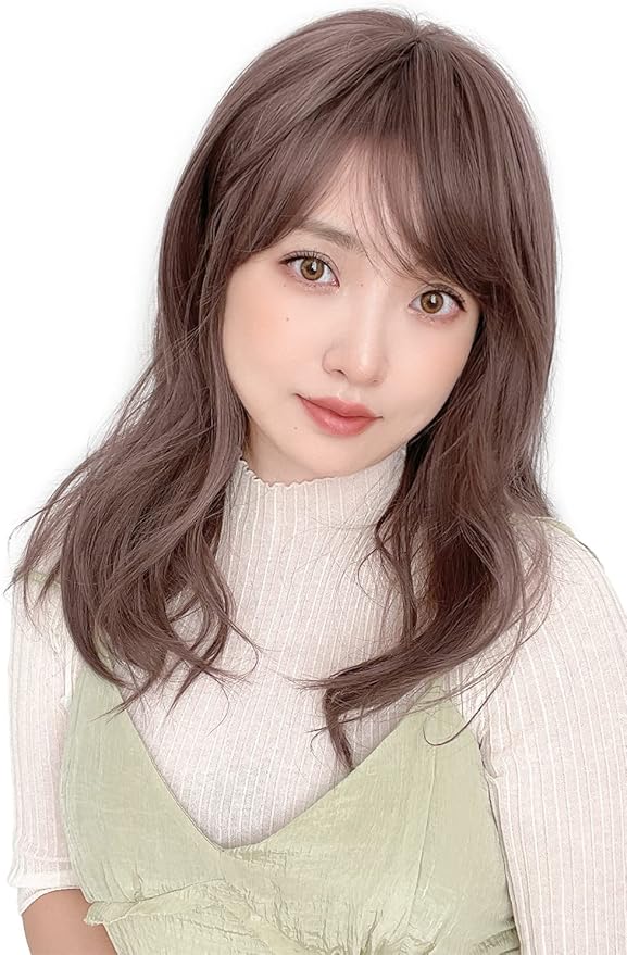 商品説明:一見ストレートに見えるミディアムヘアですが、毛先はゆるいワンカールになっており、手ぐしでくしゃっとしてルーズにかぶるとナチュラルで可愛いデザインです。 つむじ部分はO型を採用し、トップから放射線状に髪の毛が流れます。あえてしっかり分け目がつかない仕様にしているのでふわっと立ち上げたり、トップにボリュームを出しやすい作りになっています。 前髪は長めのストレートバングで、左右どちらにも分けることができ、お好きな長さにカットして着用することも可能です。 とにかく自然でウィッグ初心者の方にもおすすめのデザインになっています。定番カラーと人気カラーを厳選した全6色です。