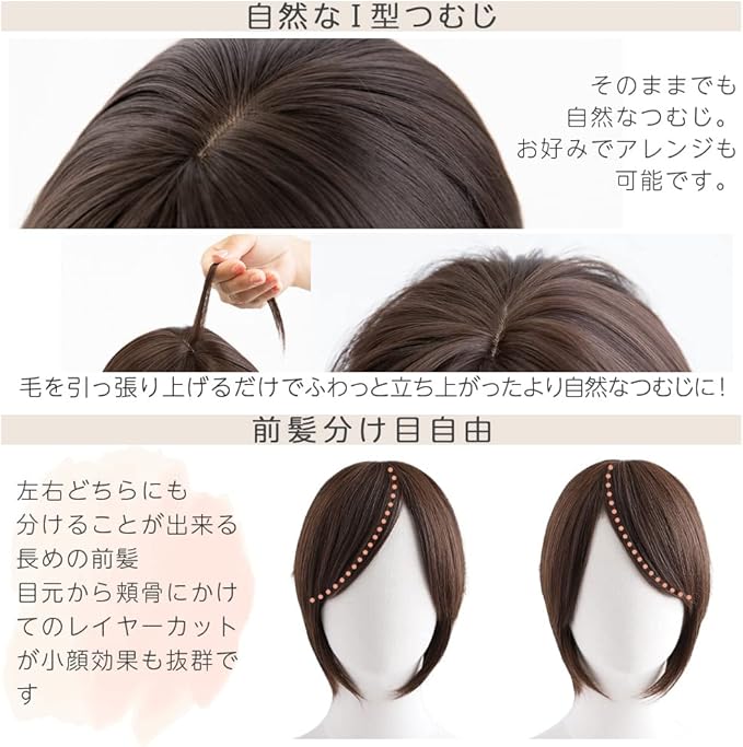 仕様:人工頭皮なし:I型つむじ 前髪分け目自由 金属不使用 シャンプー可能 ドライヤー、コテ、アイロン等で好みの髪型に整えることができます。「耐熱温度最大180度」