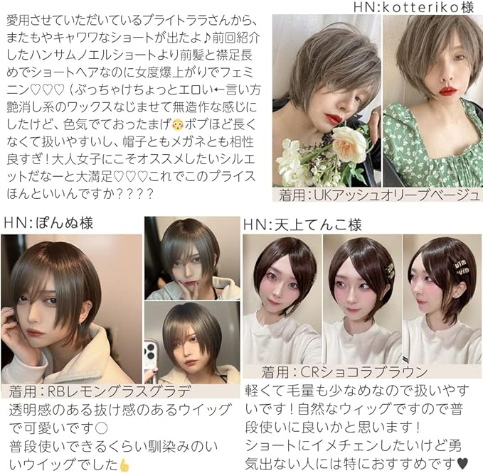 商品説明:マニッシュラフショートのようなカッコいい系ショートもお洒落ですが、ストレートのサラ艶髪が眩しい、大人な美しさを感じるクールアトレショートはいかがですか? 前髪は長めの作りで、左右どちらに分けても、またセンターパートにしても色んなアレンジを楽しめます。おでこ狭めでも広めでもどんな方にも馴染む前髪を意識しました。顔回りのレイヤーカットは正面から見てひし形になるように設計、小顔効果抜群です。襟足やサイドは短くなり過ぎないようにカットし、大人っぽさの中に可愛さも残したスタイルです。耳にかけてスッキリかぶるのも良し、まっすぐおろしてしっかり顔回りをカバーしてかぶっても良し、お好みでスタイリングしてくださいね。 春にピッタリのベージュ系ハイトーンから、使いやすいベーシックカラーまで全7色展開です。