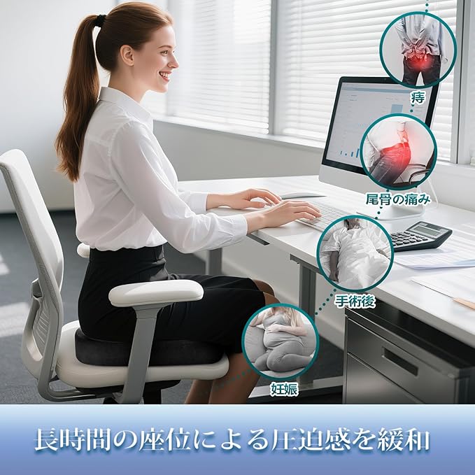 ✔️【多用途フォームクッション】 長時間のデスクワーク・在宅勤務・産後ケア・痔・腰痛対策に。自然な姿勢をサポートし、腰やお尻の負担を軽減します。また、長時間のドライブや通勤にも最適な腰痛対策クッションとして活躍します。