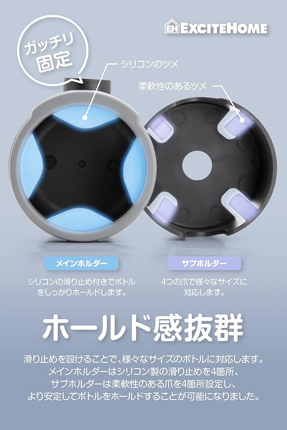 【ホールド感抜群で落下防止】 メインホルダーにはシリコンの滑り止め、サブホルダーには柔軟性のある突起が付いています。お飲み物をしっかりホールドできるため、移動中の振動によるこぼれや落下を防ぎます。※サブホルダーは補助的なものなので、軽めのお飲み物や小物を置くことをお薦めしております。