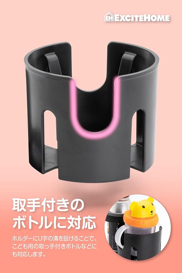【2つドリンクを固定】 メインホルダーとサブホルダーがあり、2つのドリンクを置くことができます。哺乳瓶・ペットボトル・水筒など様々なサイズに対応しており、サブホルダーには、U字の溝を設けているので、お子様用の取手付きのボトルも入れることができます。また、スマホや小物入れとしてもご利用いただけるので、お出かけに便利です。