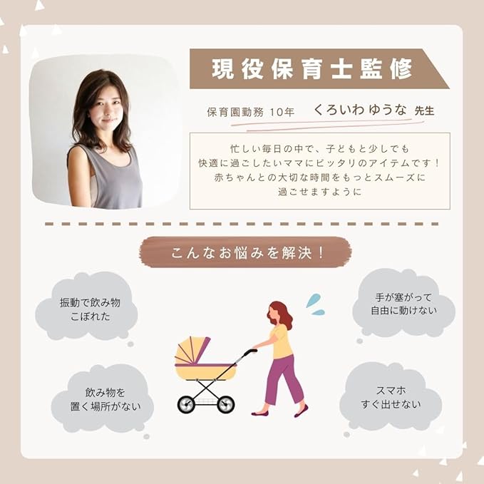 【お出かけをもっと快適に】 ベビーカーを押しながら、お散歩やお買い物をする時に、バックから飲み物を出し入れする手間が省けます。ドリンクホルダーを利用することで、両手が解放され、お子様とのお出かけをより安全に快適にします。