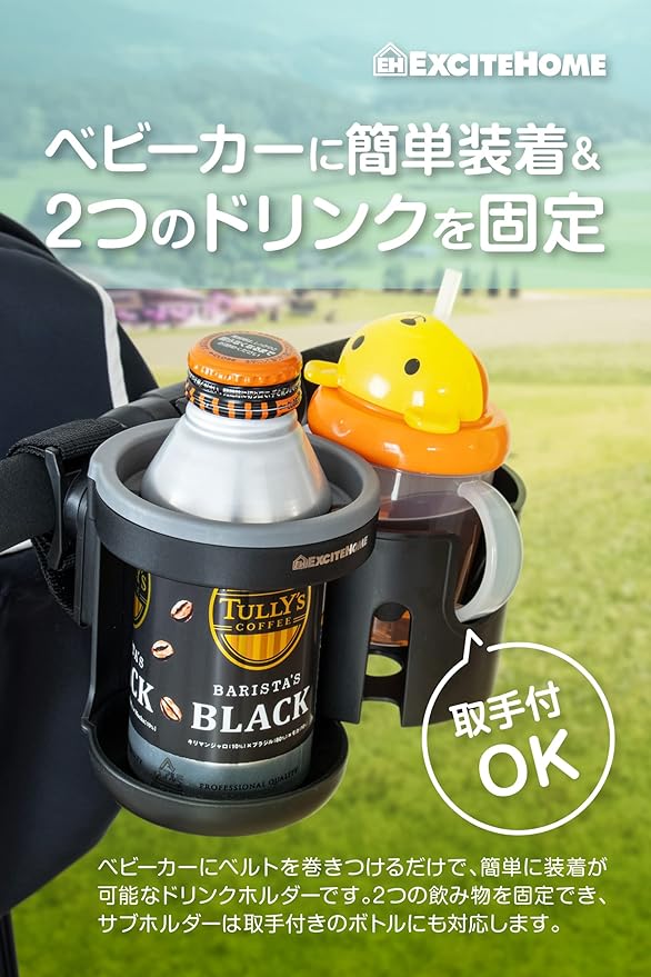 【現役保育士監修】EXCITEHOME ベビーカー ドリンクホルダー(2個) 哺乳瓶 取手付きボトル 水筒 ツイン ボトルホルダー 360度回転 角度調整可能 取付簡単 収納便利 おでかけ お散歩 快適 2-IN-1 (クリップ式)