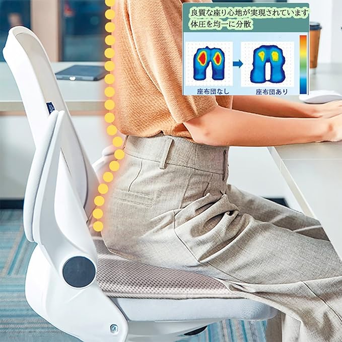 さまざまな用途:高反発ポリエステルが正しい座姿勢をキープし、骨盤周りをしっかり支えます。また、低反発よりもへたりにくく、劣化しにくいのも魅力です。自宅の椅子に使うだけでなく、車中のシート、運転席や車椅子にも置くだけで快適な座り心地に