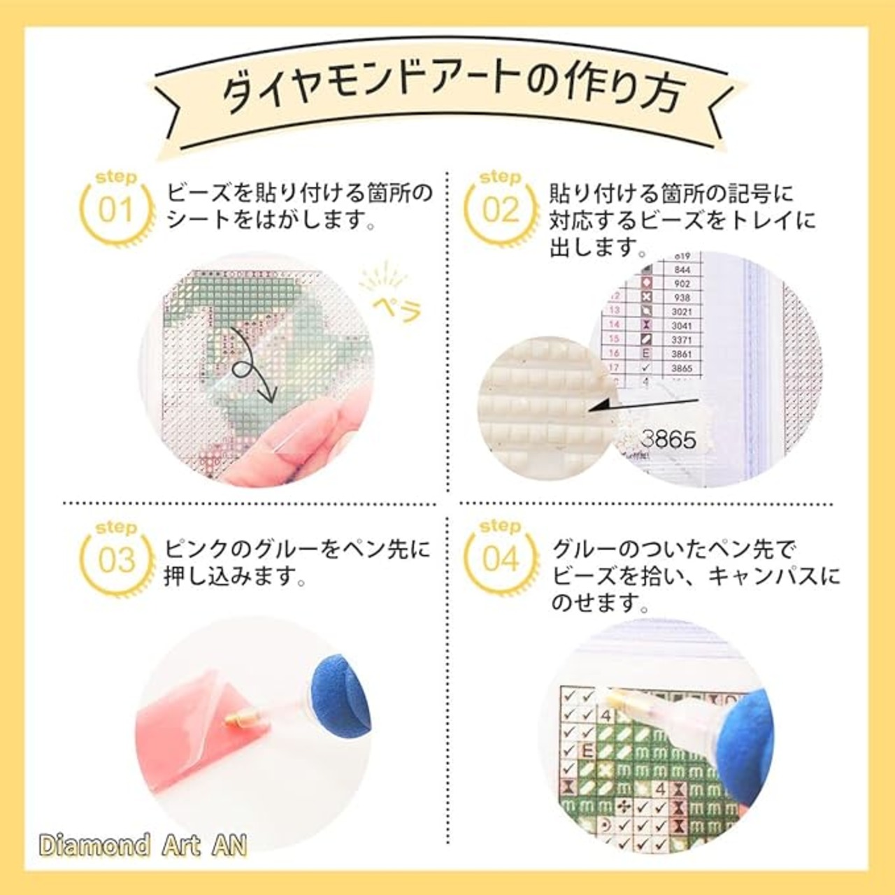 【ダイヤモンドアートとは】 2.5mmのきらきら輝くビーズを、粘着シートを張ったキャンバスに貼り付けていきます。 全て貼り付けるとキラキラ輝く素敵なアートの完成です。