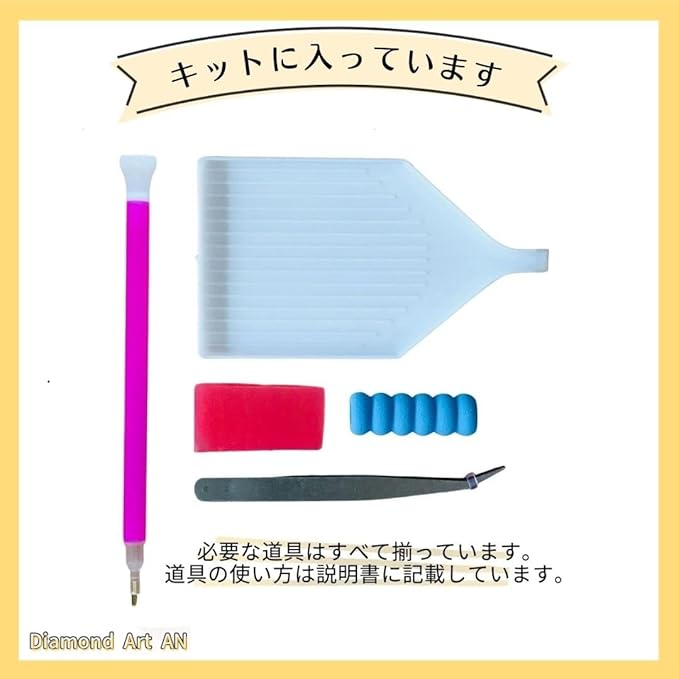 【付属品について】日本語の取り扱い説明書付き。ダイヤモンドアートに必要な道具はすべて揃っています。疲れを軽減するためのペン用スポンジや、静電気防止用シートもセットしております。