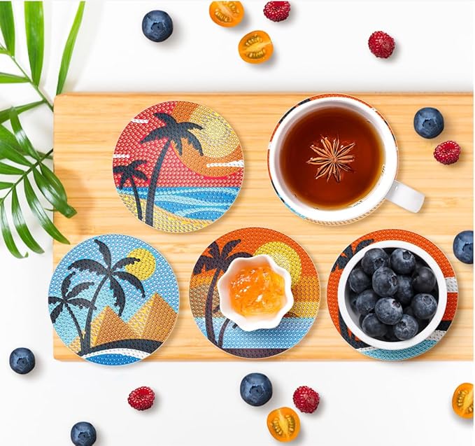 Astartia ダイヤモンドアート コースター キット DIY ダイヤモンドビーズ 5Dダイヤモンド塗装キット コースター ダイヤモンドペインティング 初心者 大人 子供用 アートクラフト用品 6枚入 ホルダー付き かわいい (パームツリートロピカル)ビーチ ヤシの木
