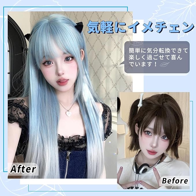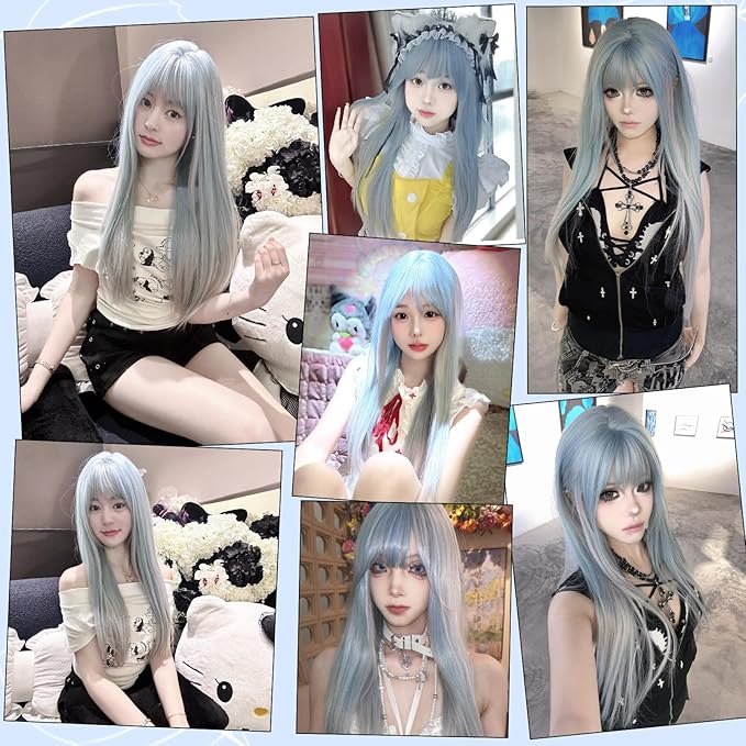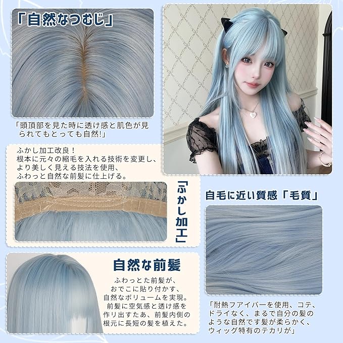 FORCUTEUウィッグ ロング 青 ブルー ストレート グラデーション グレー フルウィッグ インナーカラー 女装 自然 かつら 女性 ファッション 小顔 耐熱 普段使い ネット/櫛付き