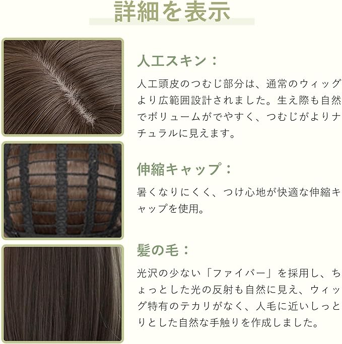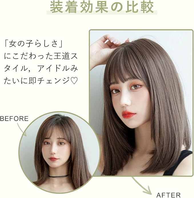 ✿ポイント:デイリーウィッグとして開発され、とても軽くてしなやかです。ウィッグ特有の不自然なテカリも無く物凄く自然で、長時間着けていても頭が痛くならず付け心地も良いので、ウィッグで悩んでいるお客様は参考にしてみてくださいね。 ※ご注意:おでこの大きさは人によって異なりますが、前髪の部分は少し長めに作っていますので、自分に合った長さをカットしてください。毛量、毛丈は、商品ごとに若干のばらつきがあります。