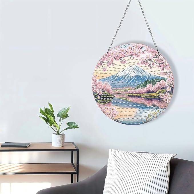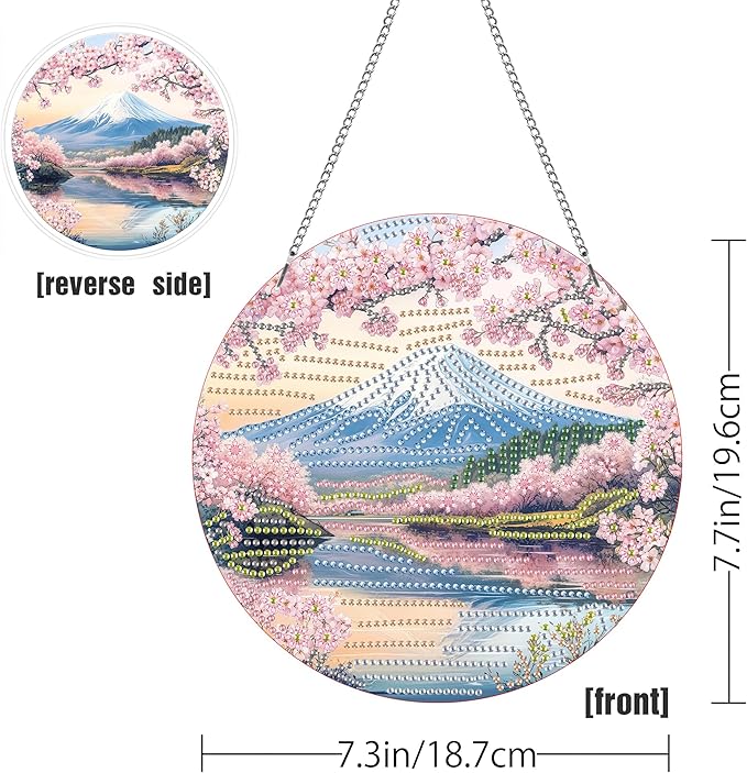LOMSIOY ダイヤモンドアートペンダント 富士山 簡単DIYビーズアート 初心者向け 桜 贈り物用 ハンギングデコレーション インテリア用 キラキラアート 特殊シェイプ チェーン付き 完成時間短 部屋・ドア・窓用 (20x20 cm)