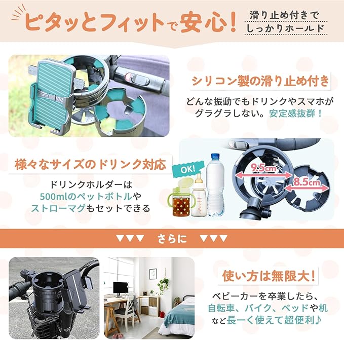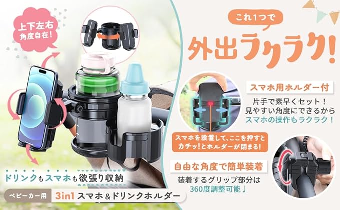 RYUCHO ベビーカー ドリンクホルダー 3in1 自転車 バイク カップホルダー スマホ 哺乳瓶 ボトルホルダー