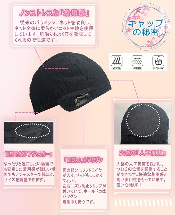 人気の秘密1--内側ヘアネットのこだわり:従来のバラメッシュネットを改良し、全体は柔らく伸びるメッシュ生地を採用するのでフィット感大幅にUP!。こうすることでウィッグと自然な繋がりもできて、まるで地毛のような「自然な産毛」を演出できます。