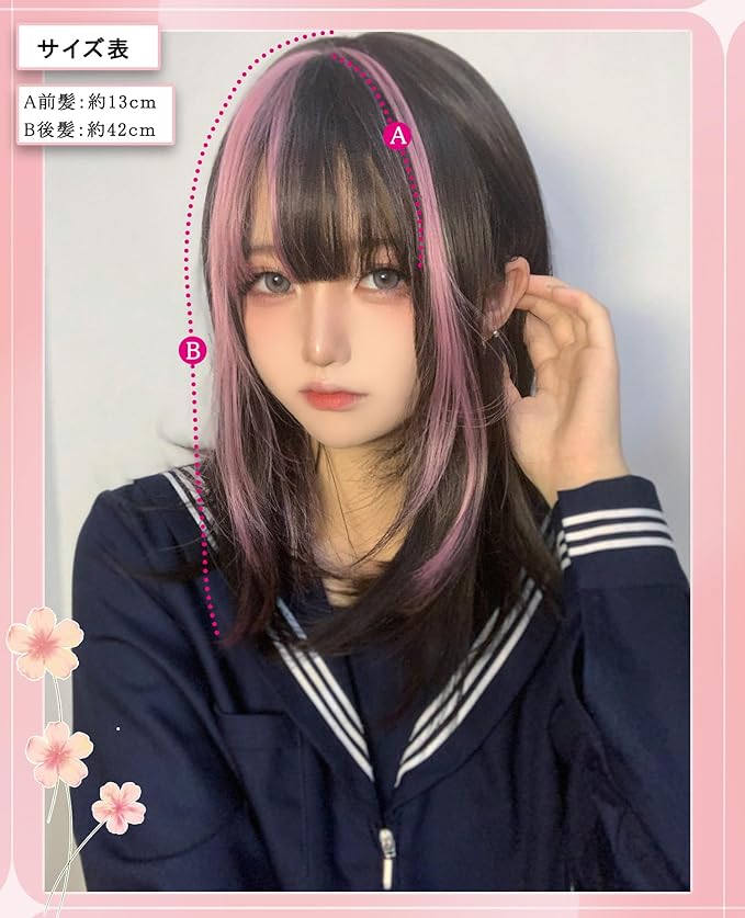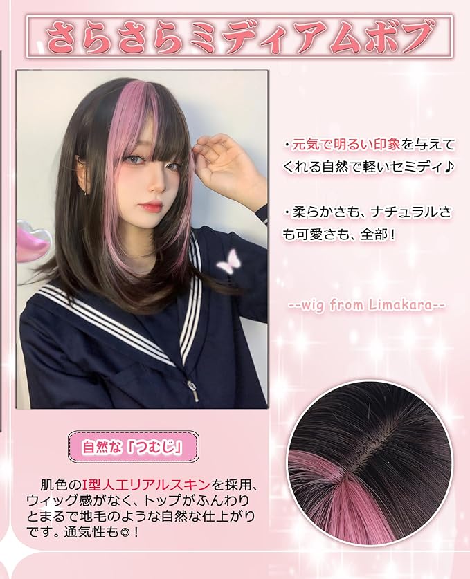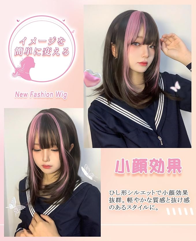 ウィッグ セミロング ボブ ストレート インナーカラー 自然 ミディアム フルウィッグ 女装 耐熱 かつら さらさら ロリータ 小顔効果 wig 原宿 ネット/櫛付き ブラックピンク