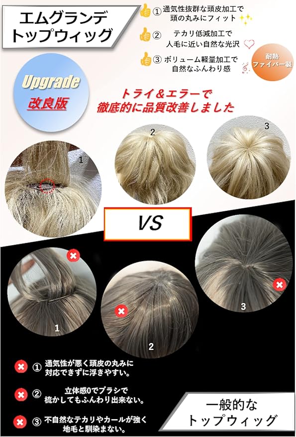 ✅【高品質ウィッグ】自然なツヤや流れにとことんこだわった頭頂部ウィッグ 分け目まで自然な仕上がり