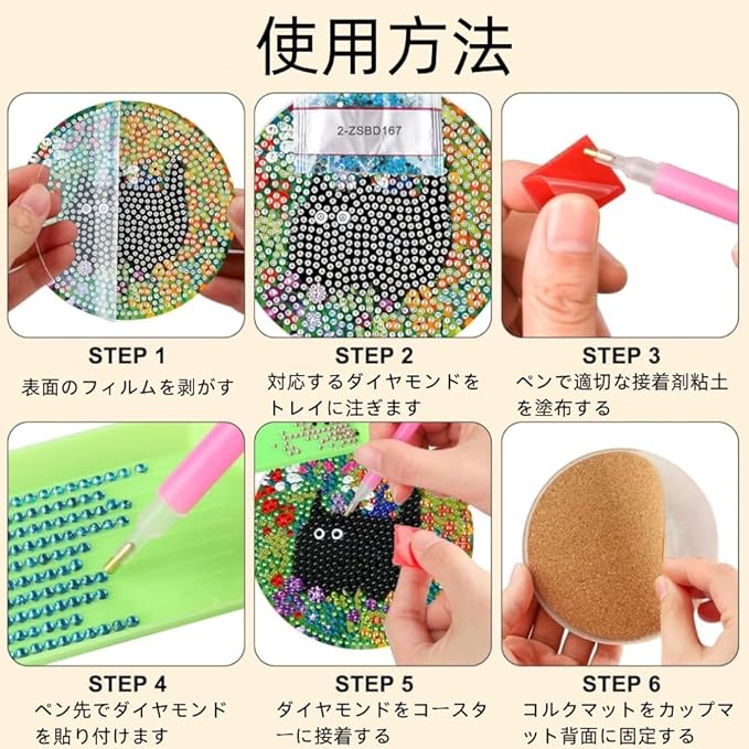 【セット内容】ダイヤモンドペイントコースター6個、コルクマット6個、カラーダイヤモンド数個、クレイペースト1個、ペン1本、ダイヤモンドトレイ1個、コースターラック1個。