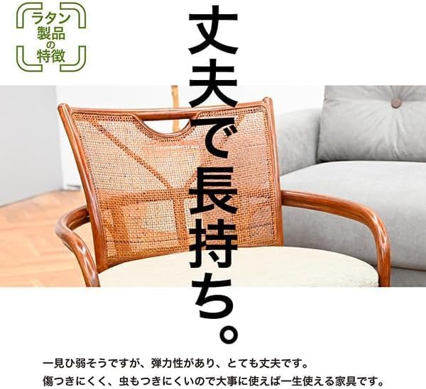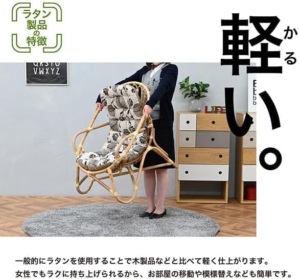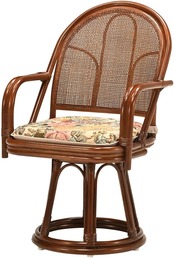 軽量で丈夫な天然ラタンを使用したラタンチェア。首元までしっかり支えるハイバック仕様。立ち座りや出入りに便利な肘付回転機能搭載。和室でも洋室でも合わせ易いベーシックデザイン。
