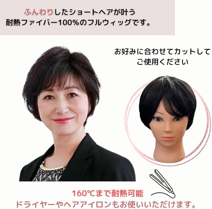 中高年フルウィッグ レディース ショートヘア かつら 自然 パーマ ふんわり ボブ 斜め前髪 軽量 快適 おしゃれ (ブラック(大きめサイズ))