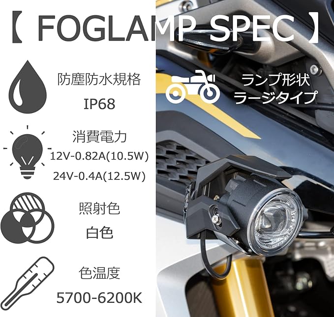 フォグランプ消費電力:21W(2灯計)、防水:IP68相当、色温度:5700-6200K