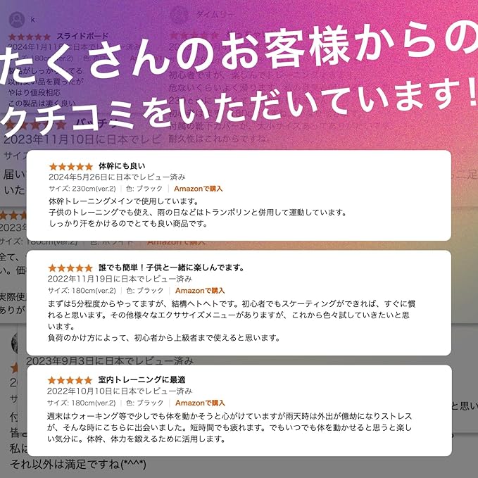 ✅【 選べるサイズ!初級者から上級者まで体力レベルに合わせた設計 】本商品は180cmと230cmの2サイズがあります。スライディングボードの面がより長い方が難易度と強度が上がります。そのため、180cmは初級〜中級者用、230cmは中級〜上級者用となっています。ご自身の体力レベル、使用用途に合わせてご使用ください。