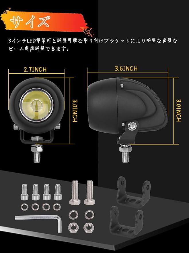 ️【 簡単取り付け & 調整可能】セット内容:ランプ 2個、取り付けネジ 2式。角度調整や吊り下げ設置も可能で、柔軟な設置が実現。