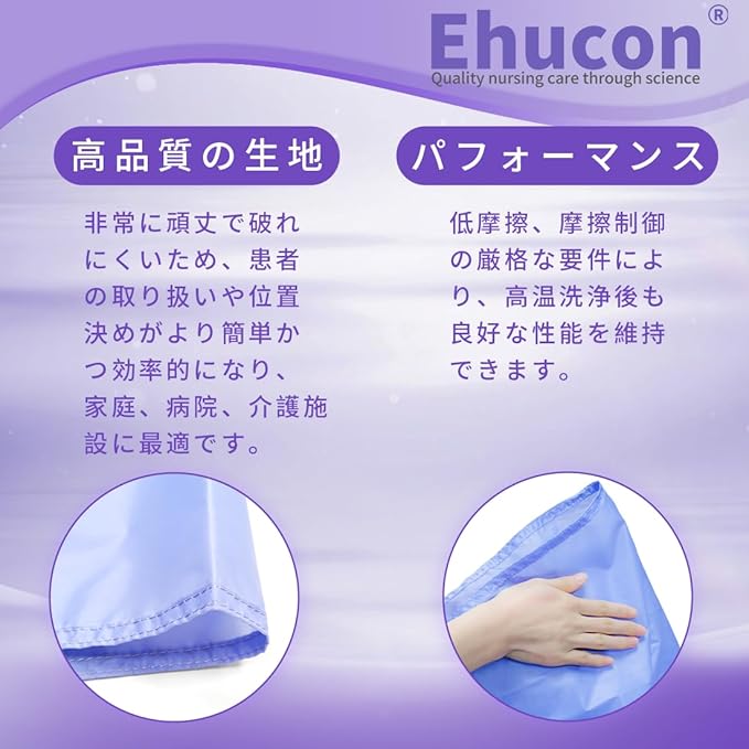 Ehucon患者スライドシートは滑る表面特性を有し、多方向スライド運動において患者の再配置を効果的に行うのに役立つ。患者をベッドから車いすに移したり、自動車/車両から移したりすることができます。このチューブ状スライドを使用すると、介護者の痛みを軽減し、高齢者脊髄への不適切なリフトアップや転移の損傷を減らすのにも役立ちます。スライドシーツは軽量ナイロンコーティングの織物でできている、80度の高温で機械洗浄を行うこともでき、病院、療養所、個人宅での清掃を容易にすることができる。この繰り返し使用可能なスライドシーツは病院や介護療養所や個人宅のユーザーに対しての賢明な選択である。