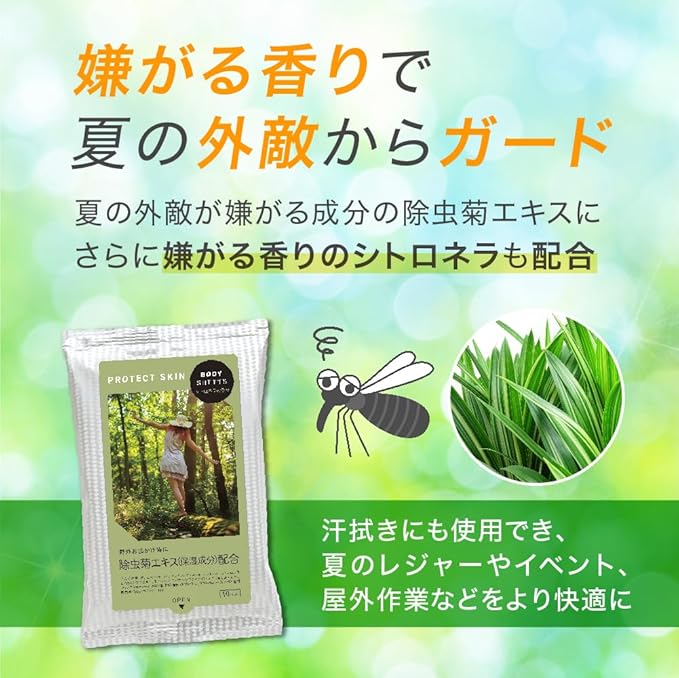 (10枚 8個) 除虫菊エキス配合 ボディシート PROTECT SKIN シトロネラの香り 保湿 アウトドア 野外作業に