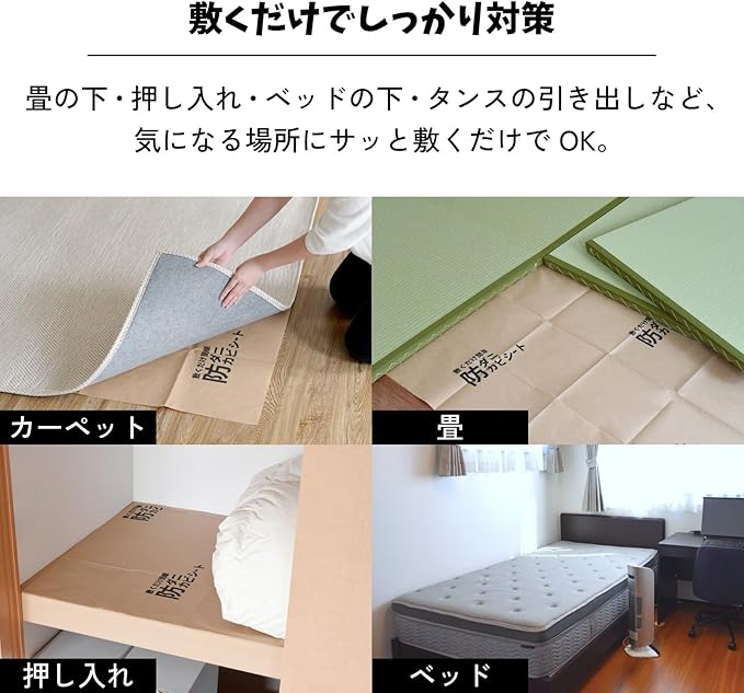 【様々な場所に】畳の下、カーペットの下、ジョイントマットの下、ベッド下、タンス引き出し、押し入れなどにお使いいただけます。