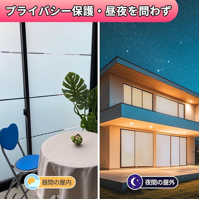 【目隠し、プライバシー保護】⇒ 外からの視線を遮りながら、充分に光を室内に取り込めます。カーテンを閉めているときの閉塞感や窮屈感のある暗い部屋から解放されます。透明窓ガラスをくもりガラスにできるお手軽シートで、目隠し効果が高いです。