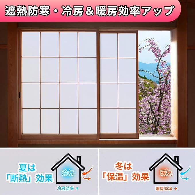 【省エネ・節電】⇒ 夏は涼しく冬は暖かく、居住スペースを快適に演出。外からの熱を遮断(遮熱效果)、お部屋の暖気を逃がしません(断熱效果)。太陽光線の熱線を遮蔽、熱気・冷気の流入出を削減することによりエアコン使用時の空調効率をUP!また、冬場の温まった空気を外部へ逃がしにくくする「冬断熱」效果が得られます。