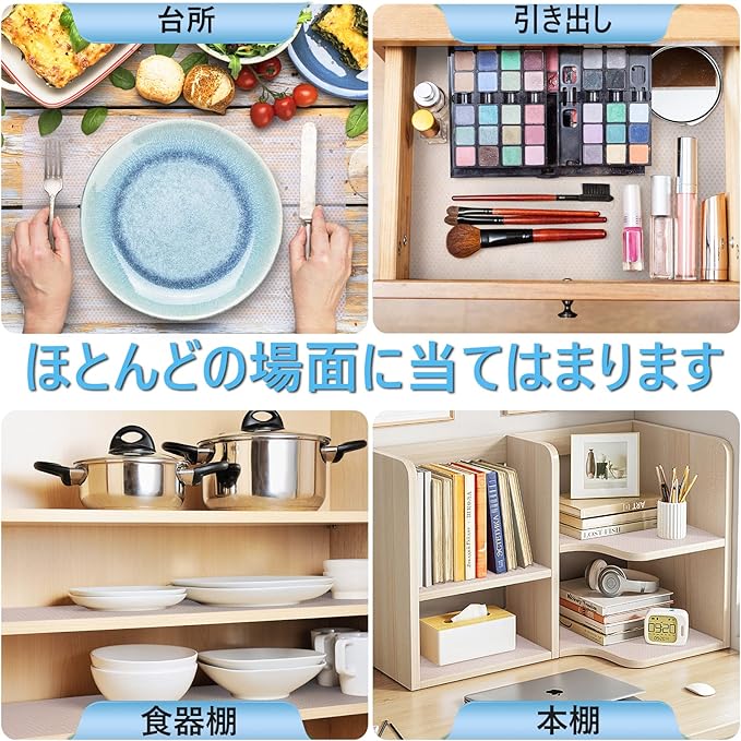 【滑り止め・非粘着性】食器棚 シートの表面にユニークな凹凸デザインで、ある程度の滑り止め効果があります。引き出しやキャビネット棚の上の物の移動を効果的に防止し、反対側は非粘着性の滑らかな表面を採用し、後ろに取り出しやすくし、食器棚 シートを使用した後に残留ゴムが残らないことを確保するようにできるため、引き出し、デスクマット、シンクなどです。