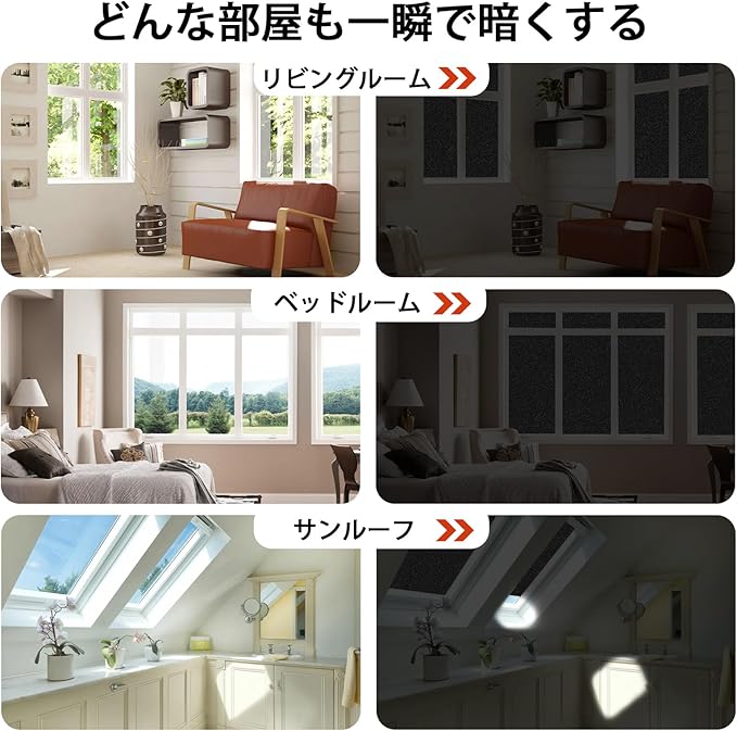 【純黒・超遮光・目隠し効果】Shackomの窓用フイルムは黒色すりガラス調。可視光線透過率0%で、純黒で全面的に不透明なガラスフィルムなので、光を全面的に遮断することができ、窓に貼るだけでお宅の大切なプライバシーをきちんと守ってくれます。夜、カーテンを開いても外から光が通さずぐっすりと眠れ、シフト制の仕事の従業員に最適。赤ちゃん、昼夜逆転の方、光に敏感な方の部屋に最適な窓ガラス目隠しシートです。朝、光漏れが減って優しくなります。夜、カーテンを開いても外から光が通さずぐっすりと眠れます。無カーテン化で部屋がすっきりして広くになります!