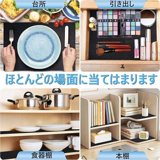 【滑り止め・非粘着性】食器棚 シートの表面にユニークな凹凸デザインで、ある程度の滑り止め効果があります。引き出しやキャビネット棚の上の物の移動を効果的に防止し、反対側は非粘着性の滑らかな表面を採用し、後ろに取り出しやすくし、食器棚 シートを使用した後に残留ゴムが残らないことを確保するようにできるため、引き出し、デスクマット、シンクなどです。