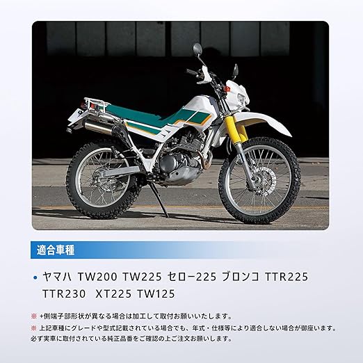 【主な適合車種】ヤマハ TW200 TW225 セロー225 ブロンコ TTR225 TTR230 XT225 TW125に適合します。※+側端子部形状が異なる場合は加工して取付お願いいたします。