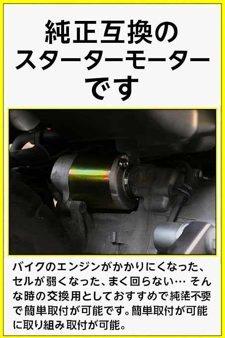 純正互換のスターターモーターです。バイクのエンジンがかかりにくくなった、セルが弱くなった、全く回らない…そんな時の交換用としておすすめです。純正同等形状のため、加工不要で簡単取付が可能です。