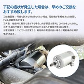 【劣化現象】下記の症状が発生した場合は、早めのご交換をおすすめ致します。①始動困難:何度も試みなければならない場合、電動機が老朽化または故障している可能性があります。②異音:始動時に異常な音がする場合、内部部品が摩耗しているかもしれません。③オイル漏れや腐食:外部に明らかなオイル漏れや腐食が見られる場合。④電流異常:バッテリーが正常でも、始動時の電流が低い場合は電動機の故障が考えられます。