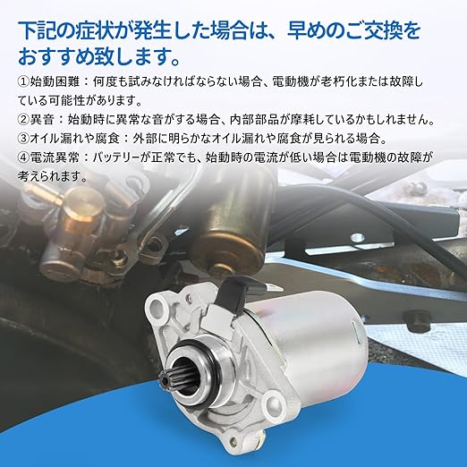 【劣化現象】下記の症状が発生した場合は、早めのご交換をおすすめ致します。①始動困難:何度も試みなければならない場合、電動機が老朽化または故障している可能性があります。②異音:始動時に異常な音がする場合、内部部品が摩耗しているかもしれません。③オイル漏れや腐食:外部に明らかなオイル漏れや腐食が見られる場合。④電流異常:バッテリーが正常でも、始動時の電流が低い場合は電動機の故障が考えられます。