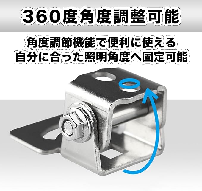 簡単に取り付け可能:ネジ穴が空いており、誰でも簡単に取り付けすることができます。ネジ穴はカーブ形状になっているため、自分好みの角度に固定することができます。ランプの上下振り向き方向もボルトを緩めて調節可能です。自分の作業がしやすいよう調節できます。