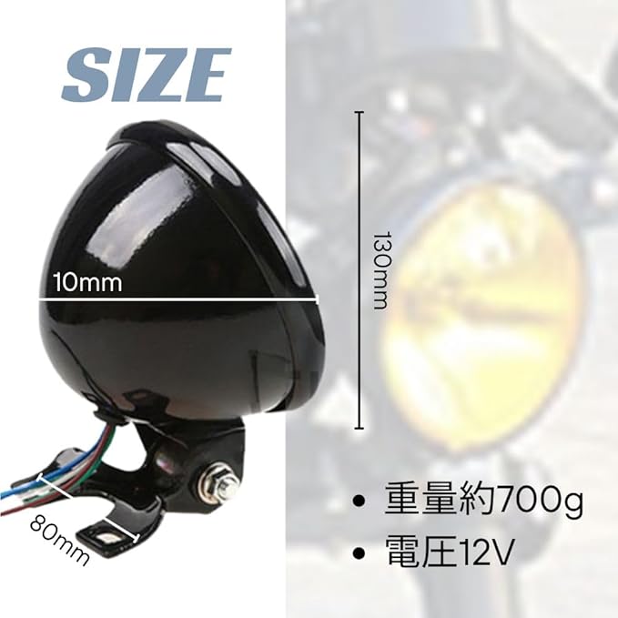 [製品仕様]バイク用ヘッドライト。材質は耐久性に優れたアルミニウム合金製で、ハロゲンバルブ搭載により夜間走行時でも安定した明るさを確保します。外径約13cm、長さ約10cm、取り付けボルト約8cm、重量約700g、電圧12V仕様。