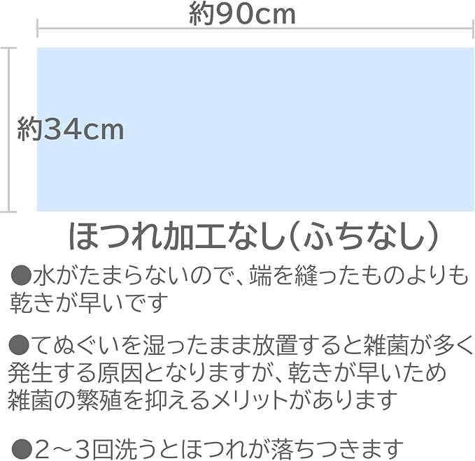 手ぬぐいの端は切りっぱなしですがその分 乾きが早く手ぬぐいに雑菌がたまりにくいなどメリットもあります。ほつれが気になるときはこまめに洗濯をすると生地が落ち着きほつれが止まります。気になるほつれは引っ張らずにほつれた糸をハサミで切り揃えるなどすると徐々にほつれにくくなります。