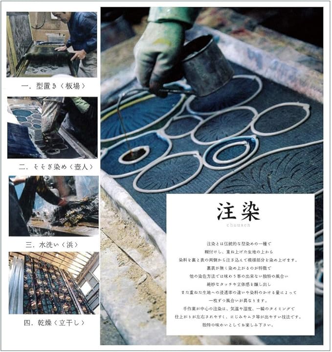 注染(ちゅうせん)技法を用いて職人によって一枚一枚染めている
