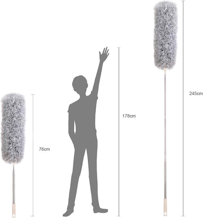 【いいデザイン】柄の長さは変えられますので、都合の良い長さに調節してお使いいただけます。伸縮可能なはたき、最長250cm、届かない場所にも届きます。 ヘッド部分は360 自由に折り曲げることができます。