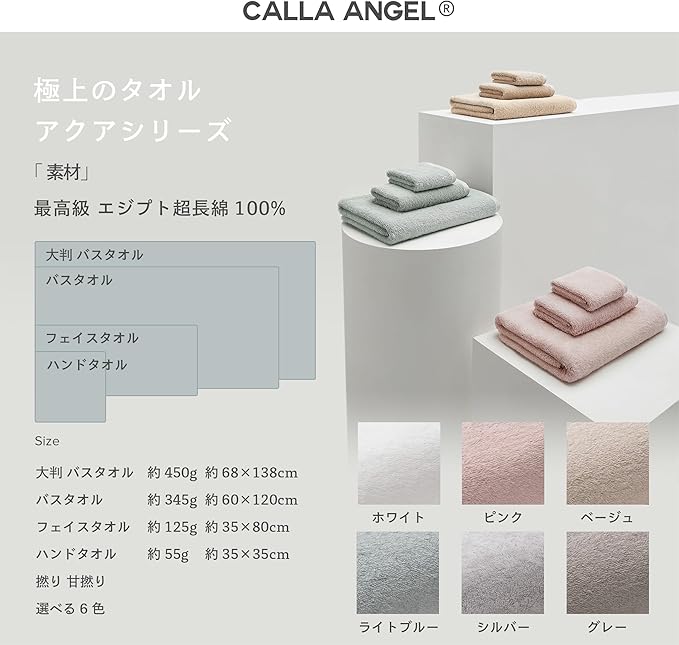 【ご家庭で高级ホテルのような贅沢感】極上のホテルタオル仕様でありながらも、日々ご使用いただけるタオルを目指しました。海外でも人気のNew Yorkブランド「Calla Angel」のアクアシリーズ、世界に誇れる確かな品質のタオルです。素材:手摘エジプト綿100%甘撚糸 /フェイスタオル: 約125g 約80 35cm